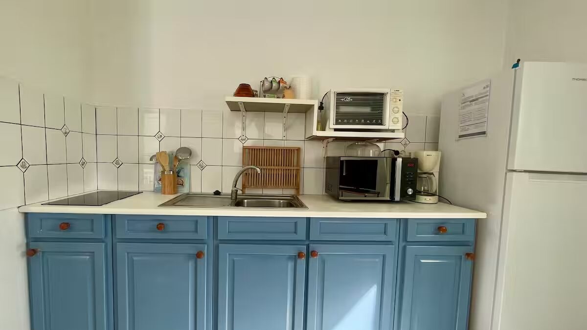 Le reste est là, prêt à vous simplifier la vie, réfrigérateur, casseroles et poêles, micro-ondes, bouilloire…Tout pour vous sentir comme chez vous !