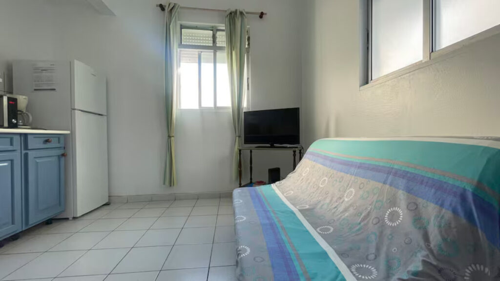 Un espace de vie tout-en-un, clair et fonctionnel, où tout est à portée de main : le canapé clic-clac confortable (qui se transforme rapidement en lit). La télé pour vos soirées, sur laquelle vous pouvez vous connecter facilement à votre compte Netflix (ou tout autre service de streaming), juste à côté et la fenêtre qui inonde la pièce de lumière naturelle. L’espace repas, avec sa table joliment dressée, invite aux petits-déjeuners tranquilles ou aux dîners improvisés après la plage.
